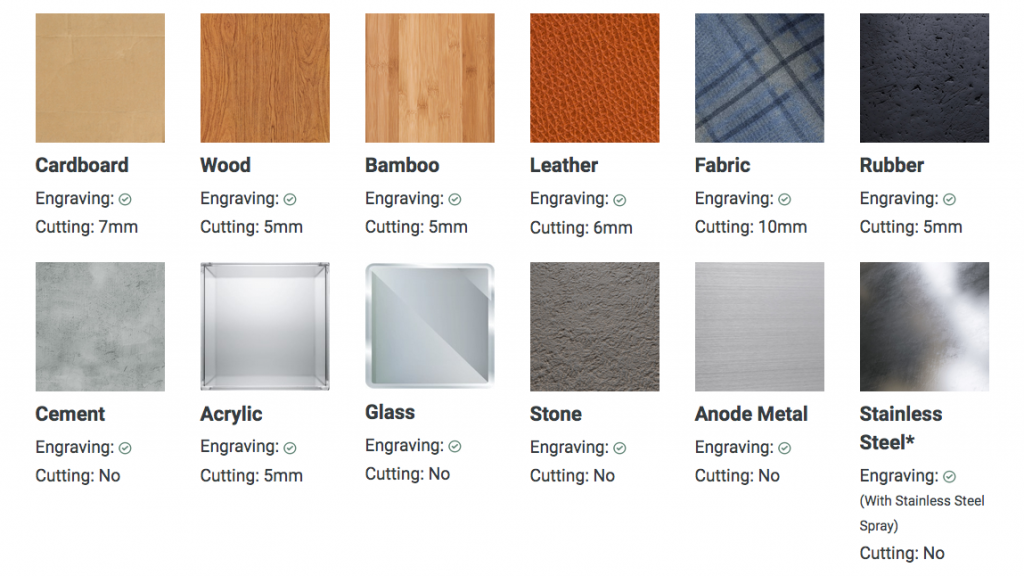 Puedes tallar, cortar y grabar en una extensa gama de materiales, incluyendo madera, cuero, acrílico, tela, cartón, acero inoxidable, ánodo, vidrio, cemento y mucho más.